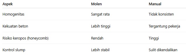 Jika proyek Anda berhubungan dengan struktur utama yang memikul beban seperti kolom, balok, dan dak lantai, penggunaan molen sangat direkomendasikan demi memastikan kekuatan dan keamanan bangunan jangka panjang.