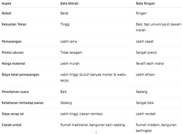 Bata merah unggul dalam kekuatan tradisional dan ketahanan cuaca, sementara bata ringan unggul dalam kecepatan pemasangan, presisi, dan kenyamanan termal.